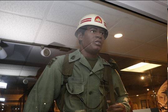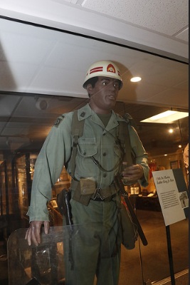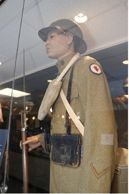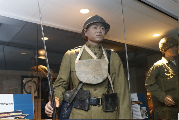 In 1917, America entered The Great War in Europe. This Soldier is part of the D.C. National Guard’s 1st Separate Battalion of Infantry, which was allocated to the French 157th “Red Hand” Division during the war. The term “Red Hand” was bestowed upon the 157th due to its tenacity in combat and is still used today as a call sign in HHD, 372d Military Police Battalion. The 1st Separate Battalion (redesigned the 372d Infantry during the war) was awarded the Croix de Guerre by the French for service in the Meuse-Argonne Offensive.
