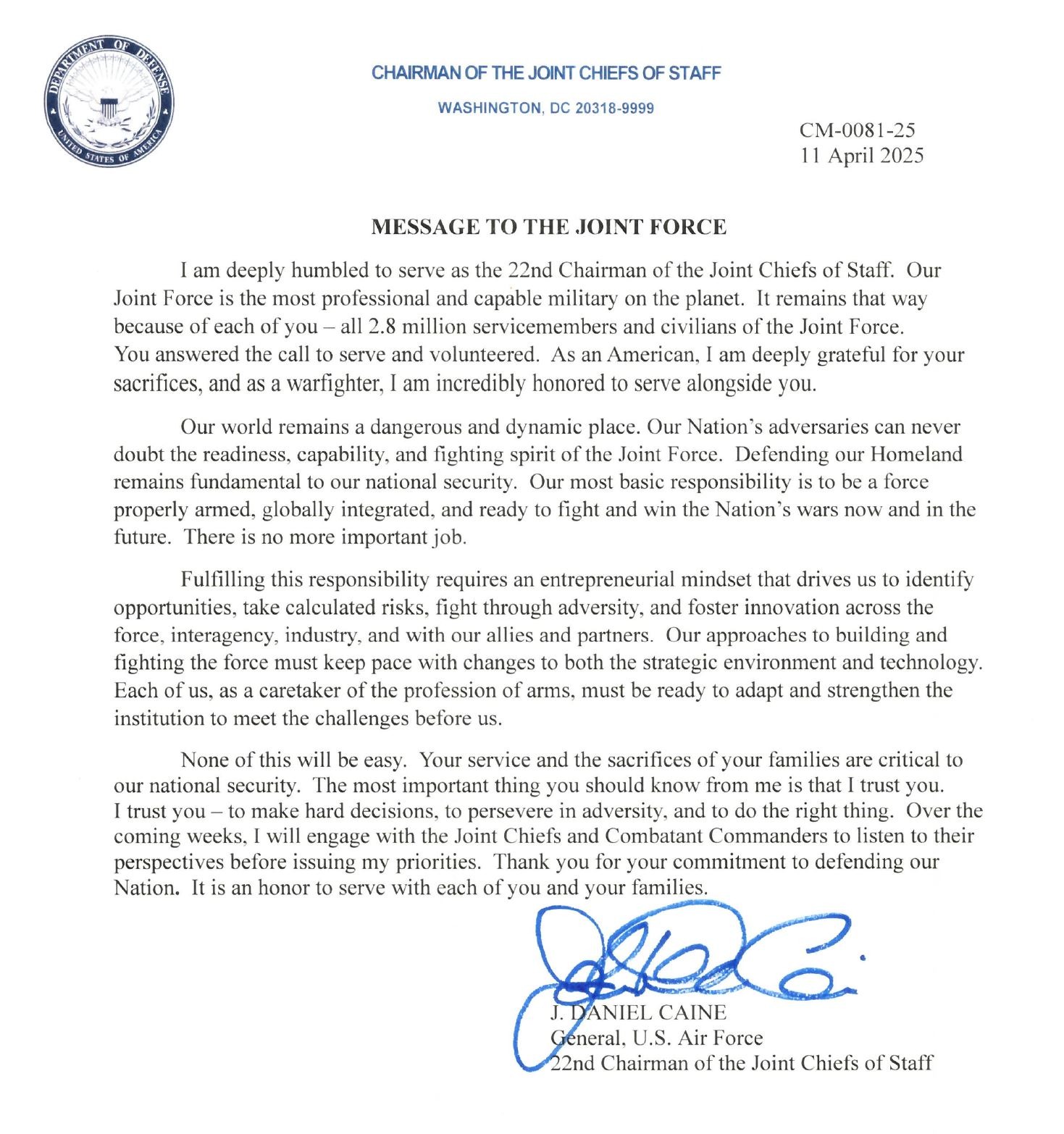 - General Daniel Caine 22nd Chairman of the Joint Chief of Staff, message to the force: